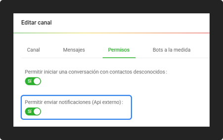 Activación de Permisos: En la configuración del canal, debes habilitar la opción: "Permitir enviar notificaciones (Api externo)"