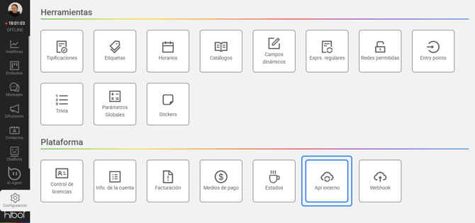 Aquí está la guía del API External de Hibot. Aprenderás cómo configurarla paso a paso.