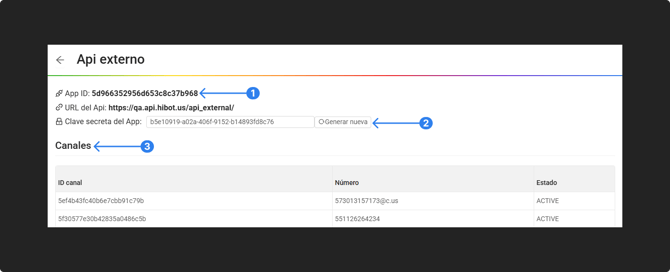 - Url del api: Es la url BASE que contiene todos los llamados, cada uno de los diferentes endpoints que puede utilizar el cliente va despues de esta url base, como por ejemplo: .../pdn.api.hibot.us/api_external/login, .../pdn.api.hibot.us/api_external/*messages*.