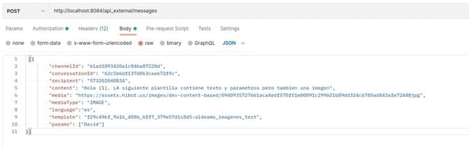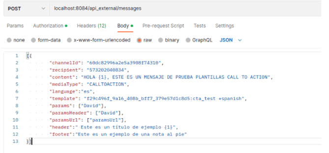 - Plantillas: channelId, recipient, content, template, params y language(opcional)