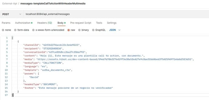 Nota: No es necesario utilizar todos los parámetros, los únicos campos persistentes son channelId, recipient, media, mediaType, template, params (Solo si la plantilla oficial lo exige).