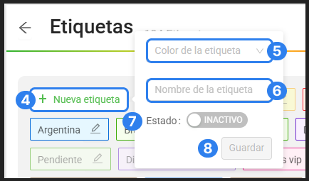 - Cuando hayas asignado el nombre, debajo de esa misma barra verás “Estado” y al frente un botón, si das clic en ese botón, podrás activar la etiqueta para ser usada.