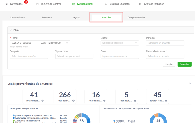 Aquí podrás encontrar todas las métricas referentes a leads que provienen de anuncios en Hibot. Conoce cómo sacarle todo el provecho de tu herramienta.