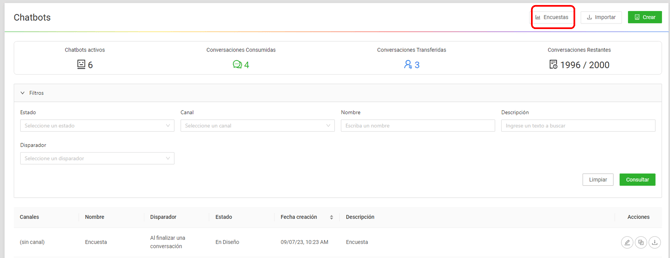 1. Ingresa al módulo de "Chatbots" y da clic en el botón superior izquierdo "Encuestas"