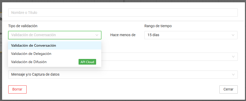 - Tipo de validación: Despliega el menú para elegir qué tipo de evento quieres verificar. Las opciones son: