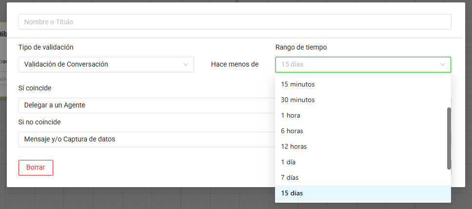 Esta poderosa herramienta te permite personalizar la experiencia de tus usuarios como nunca antes. Con este nodo, puedes verificar si un usuario ha interactuado con tu línea de una manera específica (a través de una conversación, una delegación a un agente o una difusión) dentro de un período de tiempo determinado.