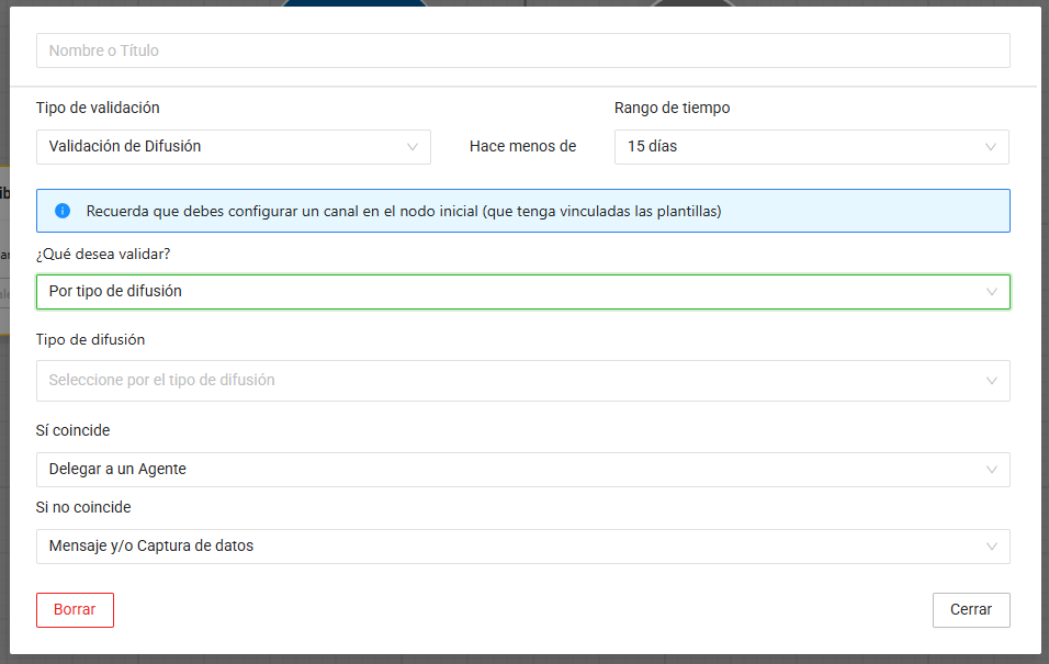 - Nombre o Título: Asigna un nombre descriptivo a tu nodo para identificarlo fácilmente en tu flujo (ej. "Verificar si recibió difusión de oferta").