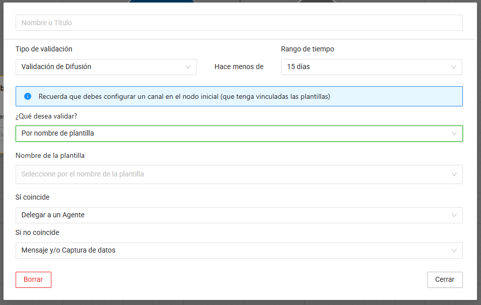 - Asegúrate de haber configurado un canal en el nodo inicial, ya que las plantillas se cargan en base al canal configurado al principio del bot.