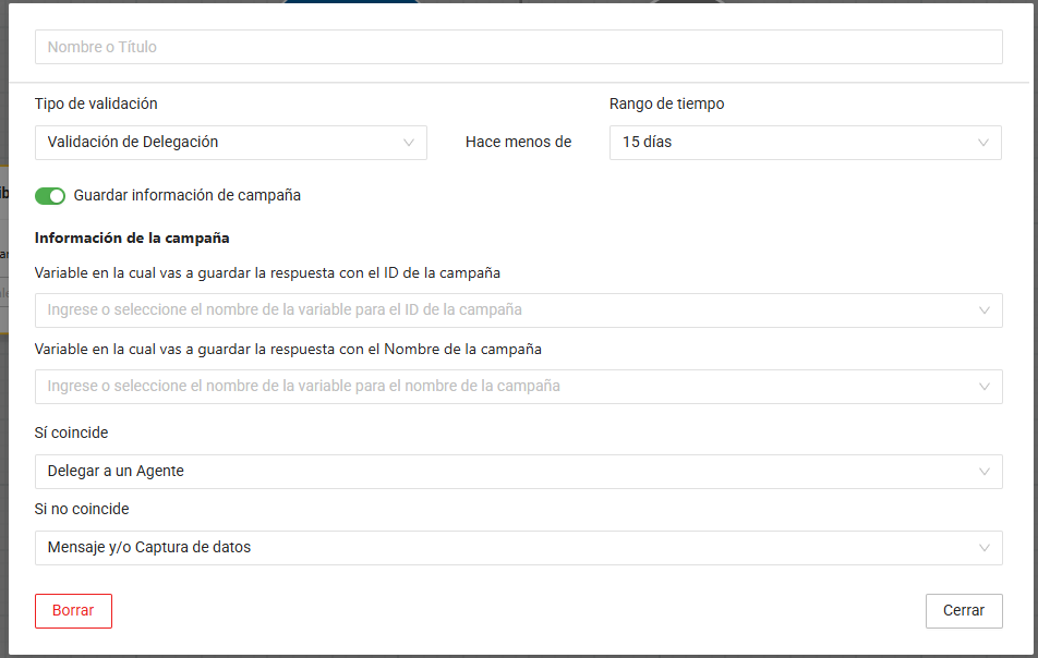 - Seleccionar campaña: Debes seleccionar la campaña a la cual va a ser redirigido el usuario cuando se encuentre en esta parte del flujo.
