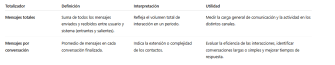 - Mensajes totales: Suma de todos los mensajes intercambiados entre los usuarios y el sistema (entrantes y salientes, incluyendo los mensajes de agente, contacto, bot, AI Agent).