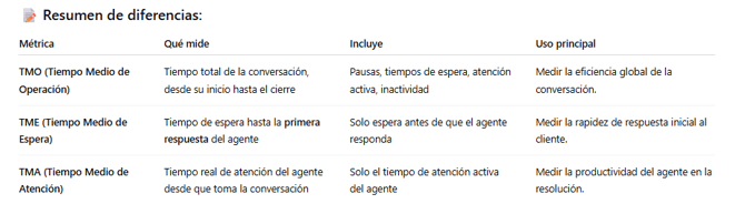 - Tiempo medio de operación (TMO): Tiempo promedio de vida de una conversación, desde su creación hasta el cierre. Incluye tiempos de espera y atención activa.