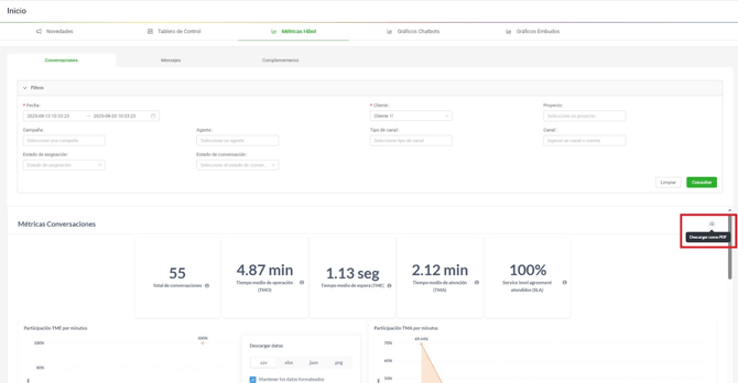 Permite descargar todo el tablero en un solo archivo en formato PDF, incluyendo todos los totalizadores y gráficas según la sección en la que te encuentres (Conversaciones, Mensajes o Complementarias). Es ideal para reportes globales o presentaciones.