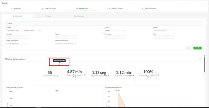 - Nivel de servicio/Conversaciones finalizadas (SLA): Porcentaje de conversaciones cerradas por día dentro del tiempo pactado.