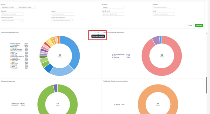 - Conversaciones: Los filtros obligatorios para esta sesión son: la fecha y el cliente.