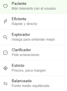• Personalidade do agente (editável): a personalidade define quantas tentativas ou o nível de tolerância do agente diante de solicitações, perguntas ou interações do usuário. Ela não define o tom nem o estilo de comunicação, mas sim o nível de tolerância nas interações. Funciona como uma espécie de limite inteligente de interações. Apenas uma personalidade pode ser selecionada.