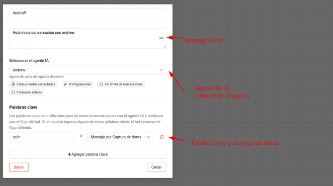 • O nó do agente de IA, as palavras-chave devem estar conectadas: Sempre que uma palavra for preenchida, ela deve possuir conexão com um próximo nó.