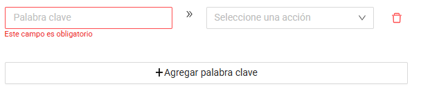 • Para a sua configuração, no campo “Palavra-chave”, deve-se definir a palavra que o contato precisará escrever durante a conversa para dar continuidade ao fluxo do chatbot. Adicionalmente, é necessário indicar ao sistema a ação que deve ser executada assim que o contato inserir a referida palavra, garantindo, dessa forma, a transição correta dentro do fluxo conversacional.