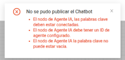 7. Uma vez desenhado todo o fluxo do chatbot, deve-se proceder com a validação e publicação. Portanto, deve-se levar em conta o status do nó ao executar esse processo de validação: