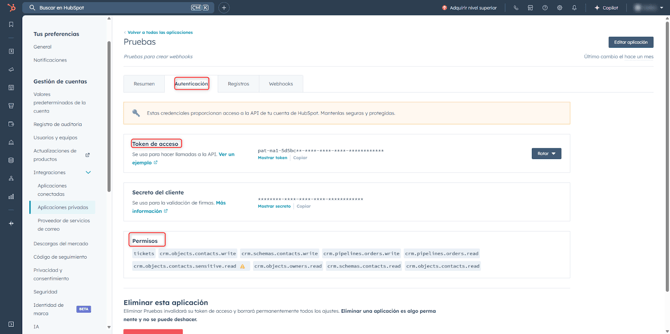 Certifique-se de configurar corretamente os scopes na aplicação privada