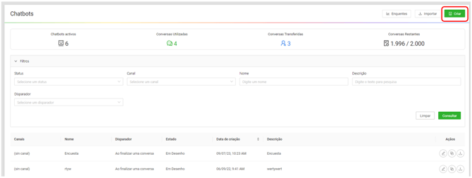 Para usar essa funcionalidade, você deve estar dentro do módulo de criação de chatbots e ter as permissões correspondentes para o módulo.