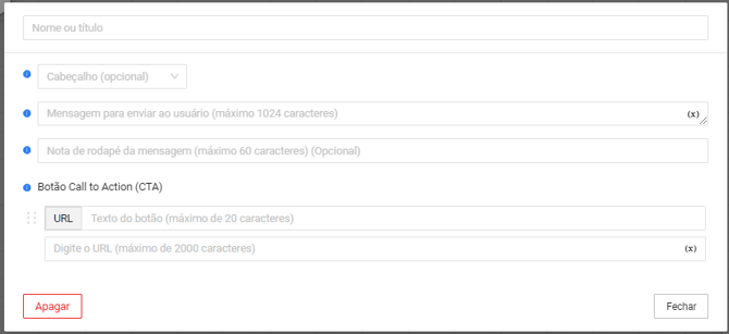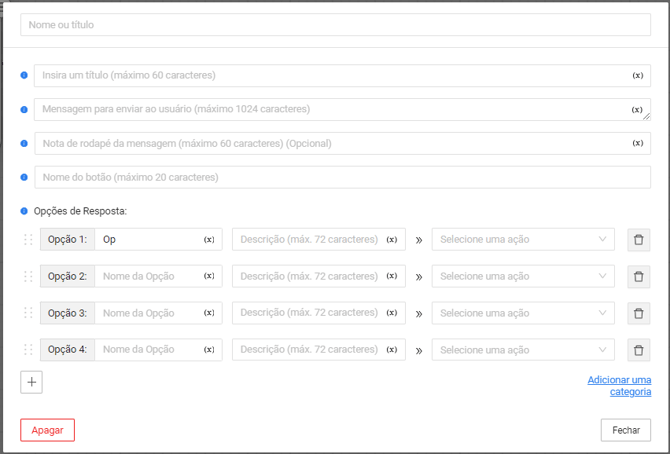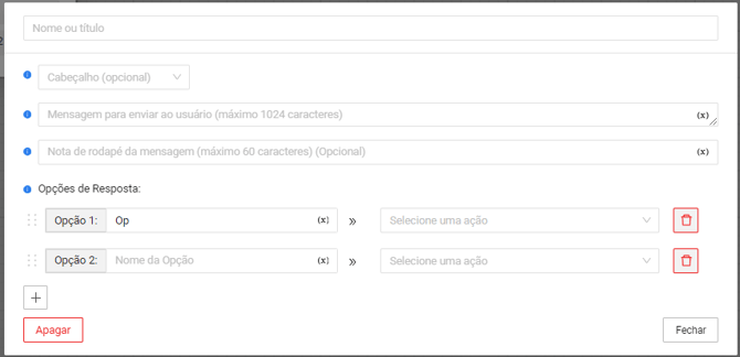 Ao usar essa funcionalidade nas opções de lista, deve-se levar em conta que deve haver pelo menos uma opção textual para que seja possível enviar a lista com pelo menos uma opção, caso nenhum campo dinâmico tenha valores atribuídos.