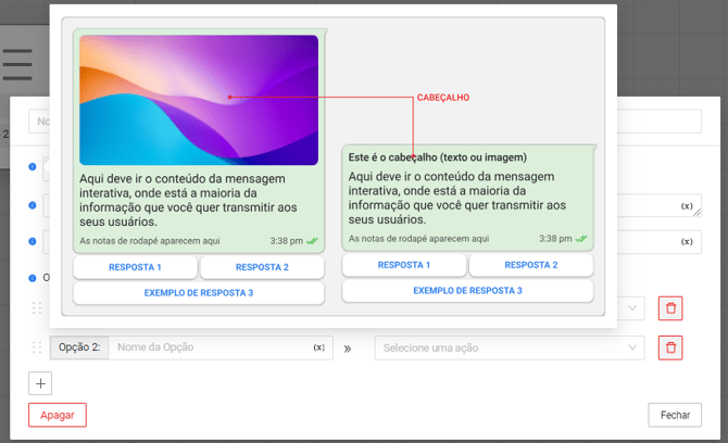 6. Configure as opções: Para isso, você deve primeiro inserir o texto que descreverá a opção e, no campo seguinte, selecionar a ação, ou seja, definir o caminho que o fluxo seguirá se passar por essa ação.