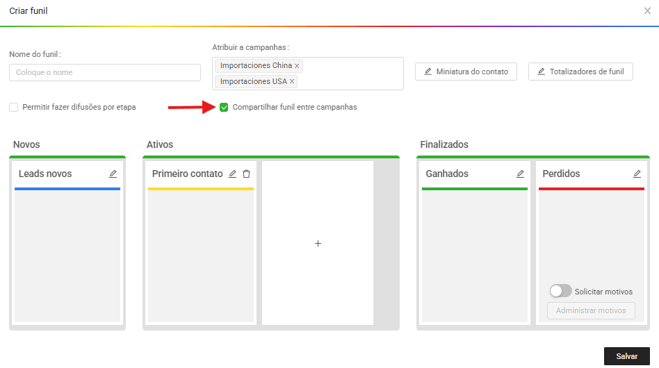 2. No campo “Atribuir a campanhas”, depois de selecionar mais de duas campanhas, será ativada a opção chamada “Compartilhar o funil entre campanhas”.