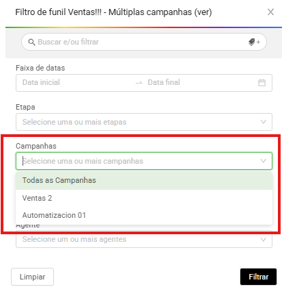 E na janela que se abre, no campo “campanha”, selecione a(s) campanha(s) que deseja filtrar.