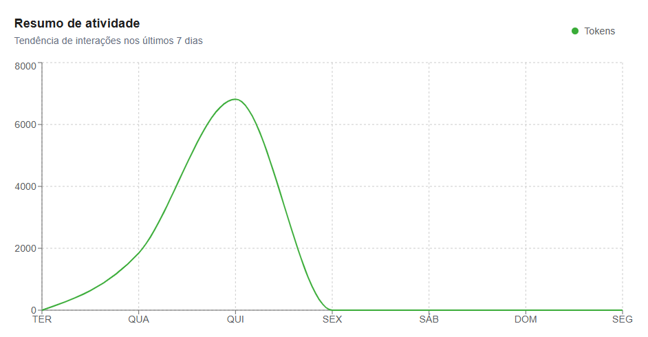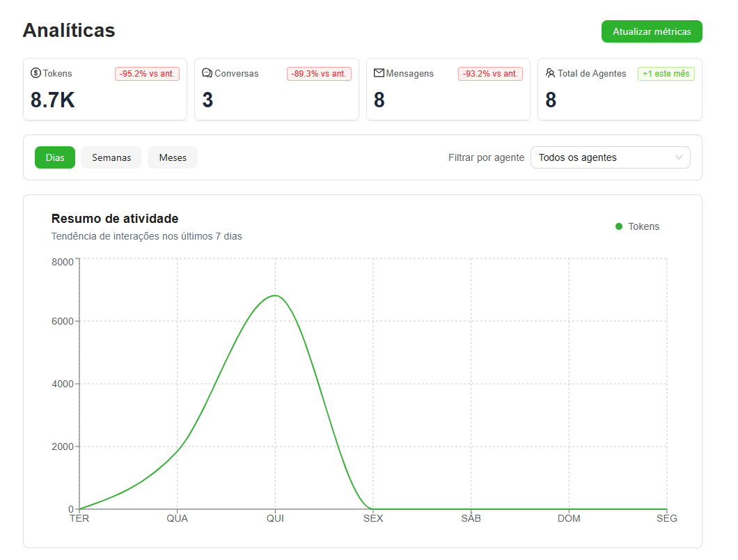 No dashboard principal, você encontrará o Resumo de Atividade, onde poderá analisar o desempenho dos seus agentes conforme diferentes períodos de tempo.