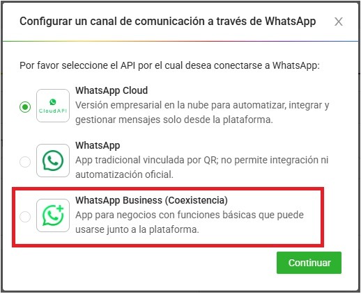 Selecione WhatsApp Business (Coexistência) para continuar o processo.